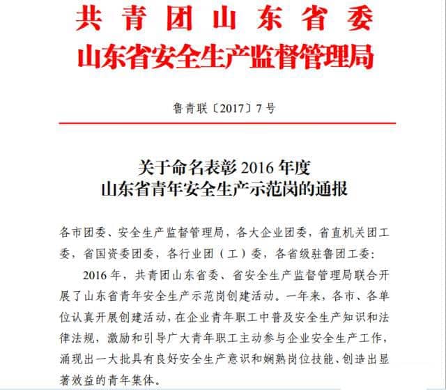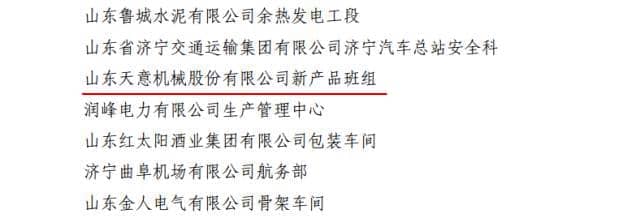為激勵引導全省廣大青年職工強化安全生產意識,提高安全生產技能,參與安全生產管理,2016年共青團山東省委、山東省安全生產監督管理局聯合開展了山東省青年安全生產示范崗創建活動。山東天意機械股份有限公司新產品班組榮獲2016年度“山東省青年安全生產示范崗”